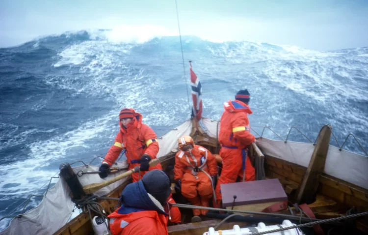 Vi hadde bak oss 4400 nautiske mil i den nordlegaste Atlanterhavruta via Shetland, Færøyane, Island, Grønland, Baffin Island, Labrador, New Foundland, Nova Scotia til New York. Dette var på dagen 150 år etter at den første Immigrantskuta «Restaurationen» fra Norge kom dit med 54 nordmenn, den yngste født undervegs på den langt sørligare ruta dei hadde fylgt. Dette er «Leiv Eiriksson-dagen» i USA. Under den kongelege banketten sat vi på bakerste benk i i våre beste klede med «propeller». Der og då slo det meg, og vart noko eg berre måtte gjera. Dette må seglast ommat på rett vis; Med eit ekte vikingeskip.